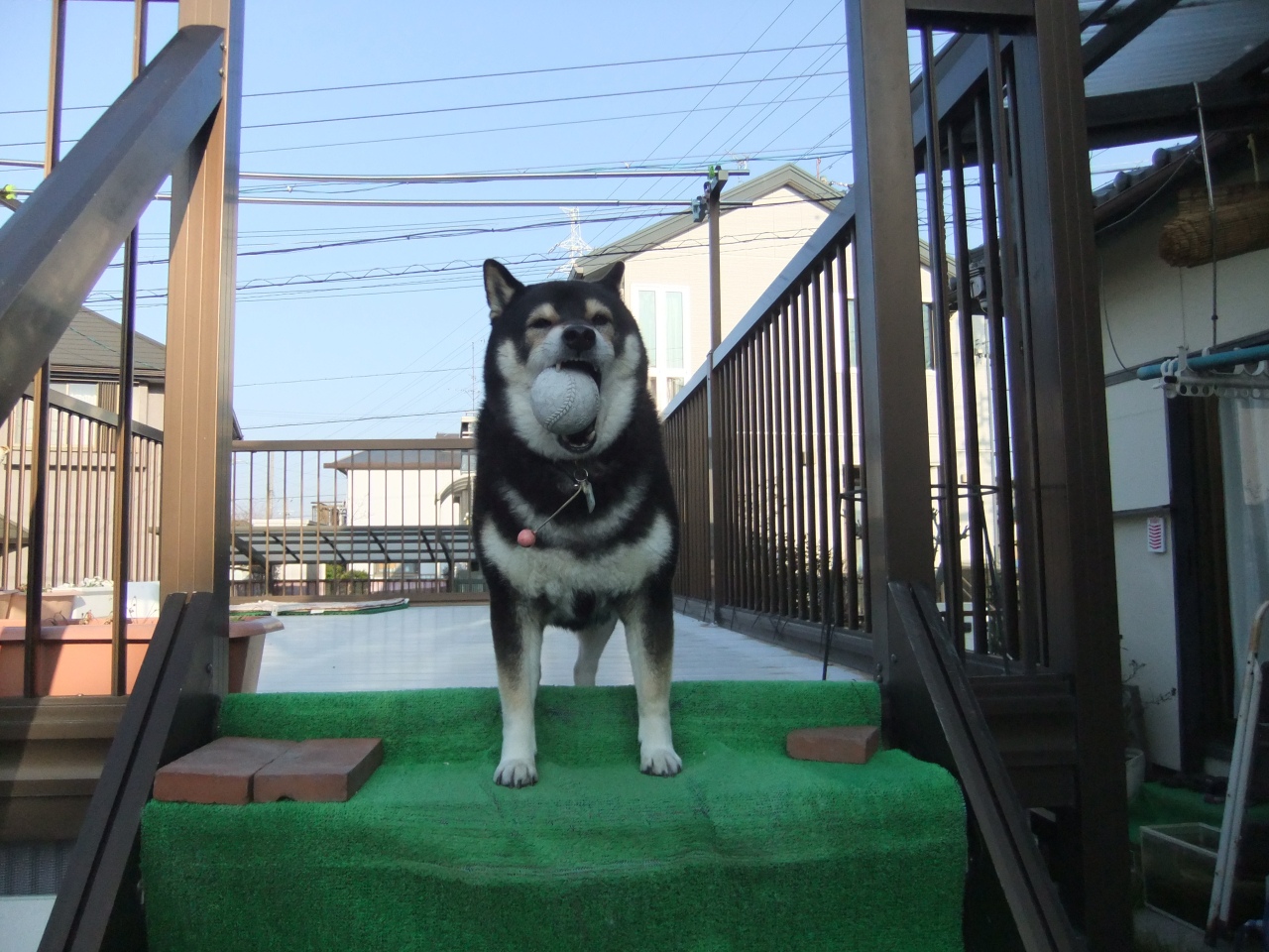 咥えたボールをベランダの階段の一番上から転がして「取ってこい」をするところ。自分がボールを転がして人にとってこさせるのが好きだったね
